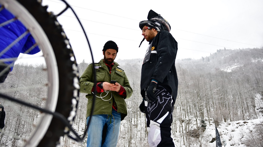 The course of the race, for the most part, had a thin layer of fresh snow and thick ice below it. Bikes had screws on the tyres which were supposed to provide traction on ice. And yes they did!